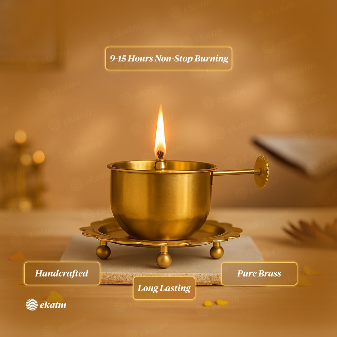 The diya is built for Akhand Jyoti – a continuous flame that is believed to bring peace, positivity, and protection to the home. It burns for over 9 hours using just 50ml of oil or ghee, with a refill required every 4-5 hours.